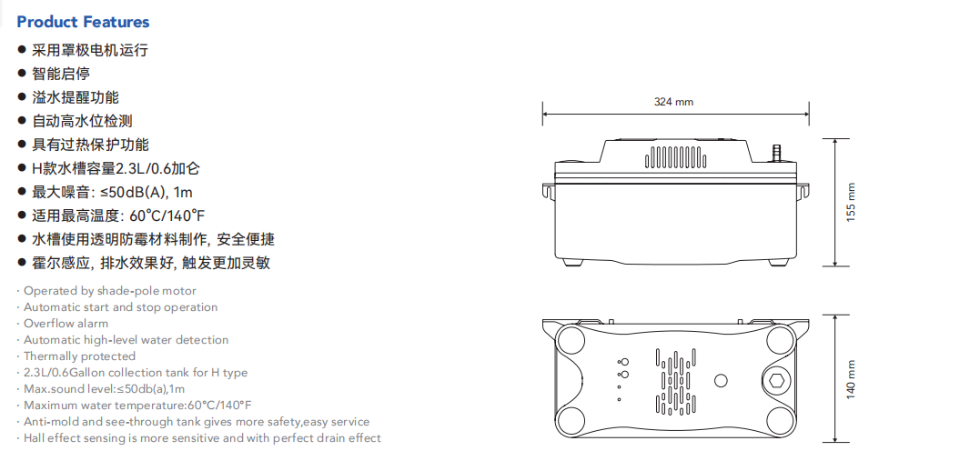 设计用于在无法进行重力排水的情况下自动从空调,制冷和除湿设备中收集和去除冷凝物。也适用于高效率的燃油和燃气冷凝炉和冷凝锅炉设备。